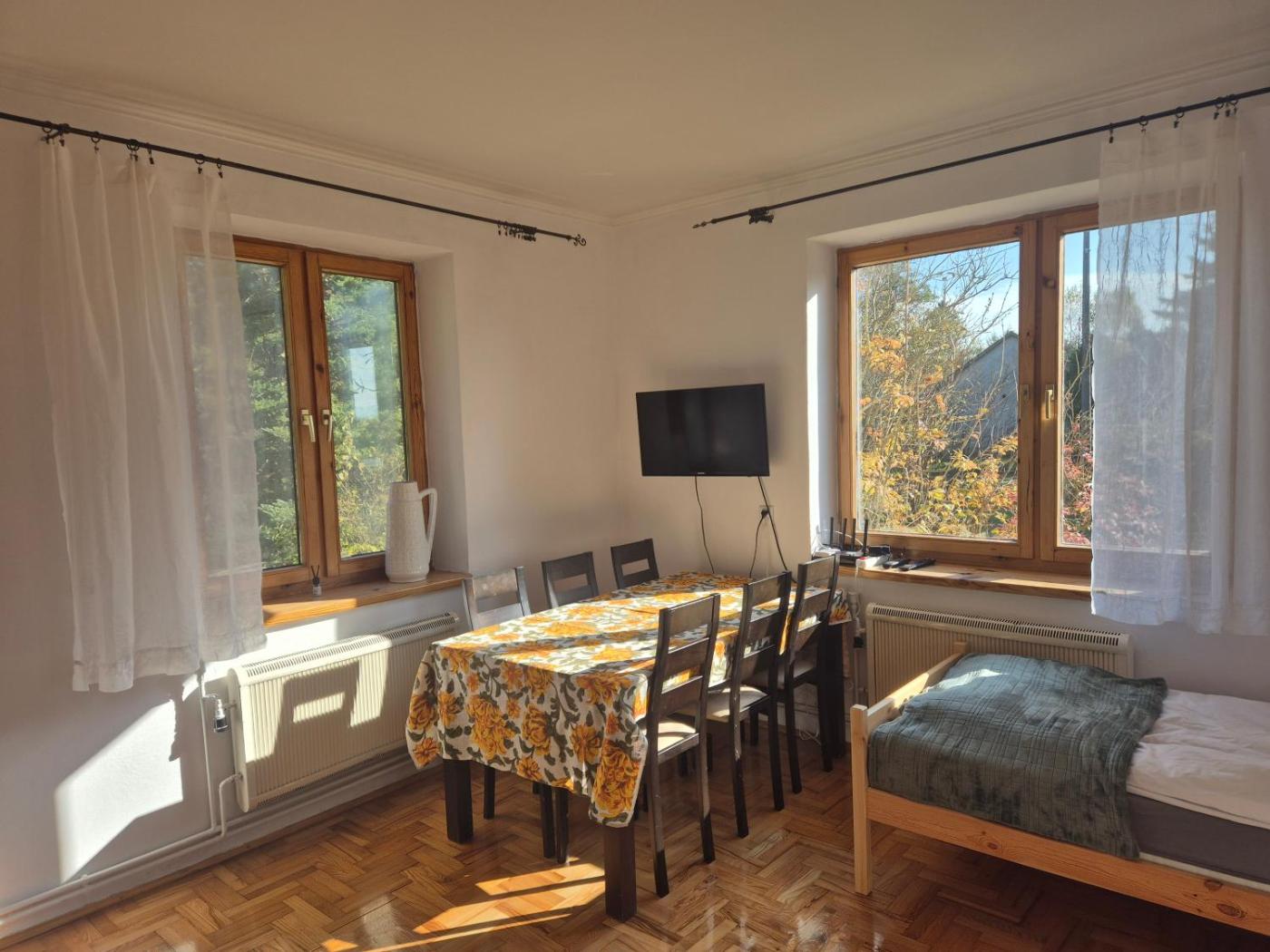 Apartament z 3 sypialniami. The spacious apartment features a shared bathroom, a washing machine, a private entrance, as well as a seating area with a flat-screen TV. In the fully equipped kitchen, guests will find a stovetop, a refrigerator, kitchenware and an oven. Among the room amenities are a dining area, an electric kettle, parquet floors as well as an outdoor dining area and garden views. The unit offers 10 beds. Apartament - 10 osobowy. Powierzchnia pokoju ok.: 150 mkw.